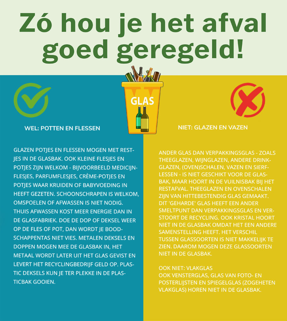 In de glasbak mag alleen leeg verpakkingsglas van eten, drinken, cosmetica en medicijnen.