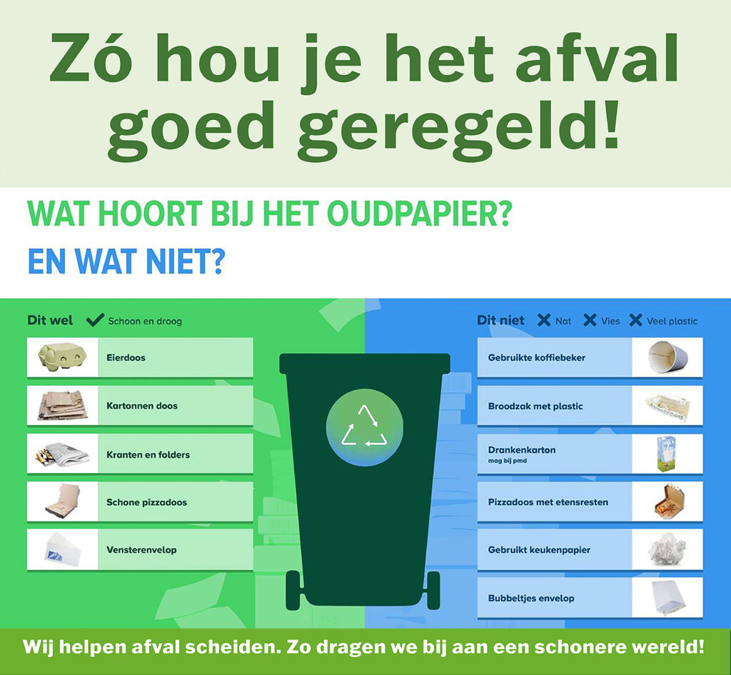 Kranten, folders, enveloppen, wc-rolletjes en kartonnen dozen: het mag allemaal bij het oud papier. (Maak het papier/karton zo klein mogelijk)